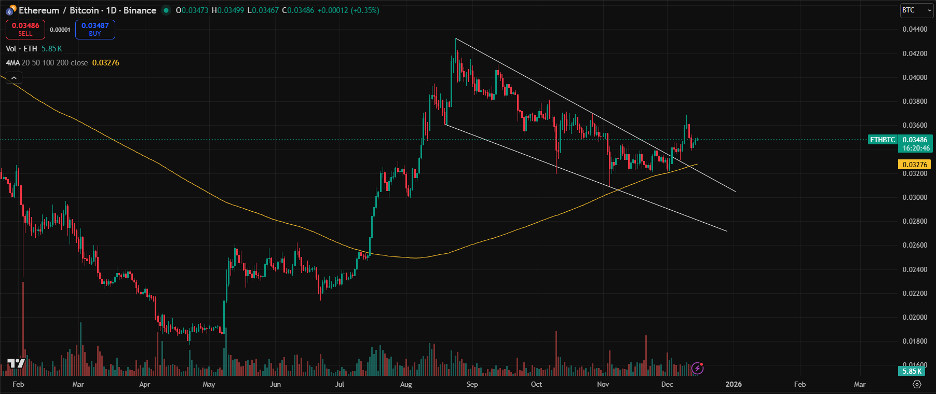 ETH has been outperforming Bitcoin during the current market consolidation – ETH/BTC has broken out upwards of a “bullish pennant” pattern and is holding above its 200-day moving average.