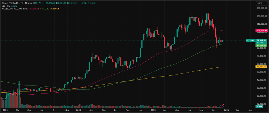 Bitcoin is consolidating between $85,000 - $95,000 and holding the 100-week moving average will be key for the bellwether crypto to stage a decisive bullish reversal.