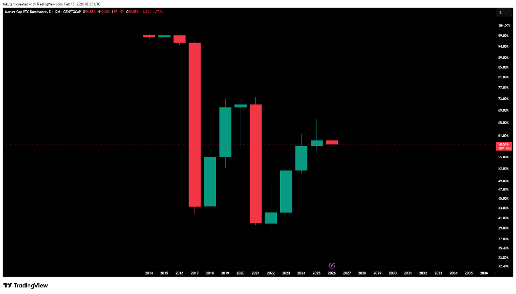 This pattern echoes prior cycle corrections where Bitcoin dominance expanded as risk appetite contracted, only to see a reversal (known as "alt season") once Bitcoin re-established a stable base. The current BTC dominance expansion may indicate a market that is repricing risk premiums across the crypto spectrum, consolidating around the highest-conviction asset before risk appetite returns.