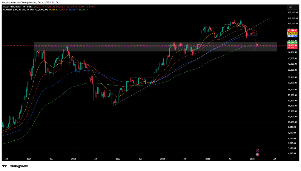Bitcoin is currently at the 200-week moving average and testing the key $65,000–$70,000 psychological support zone. Further decline is expected if this previous resistance turned support zone does not hold.