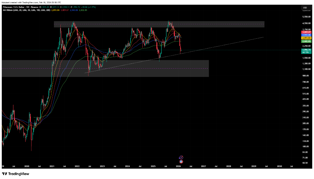 As of this writing, ETH is trading near $1,950, approaching the ascending trendline support of a potential multi-year ascending triangle forming on the weekly timeframe. Should ETH hold the rising trendline support, the pattern remains intact and would set up a potential breakout toward new all-time highs over the medium term.