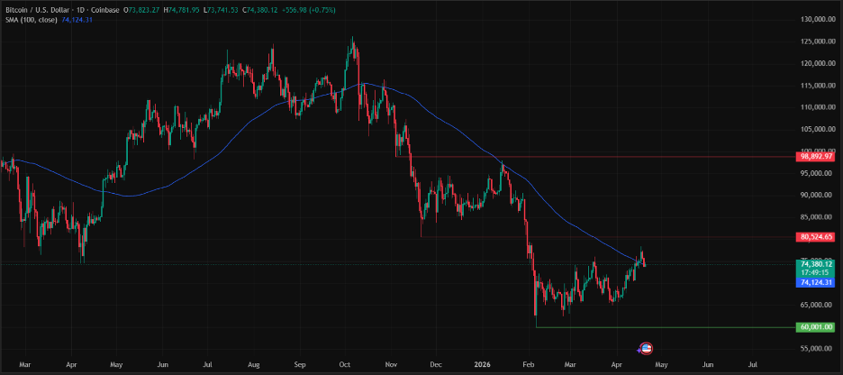 April has been almost entirely geopolitics driven. Every significant price move in crypto has traced directly to developments in the Iran conflict and their effect on oil. Bitcoin's intra-month range from approximately $65,000 to $78,000 maps almost precisely onto the arc of the ceasefire: announced April 8, partially unraveled by April 13, briefly revived April 17, and deteriorating again as its expiry approaches Wednesday.