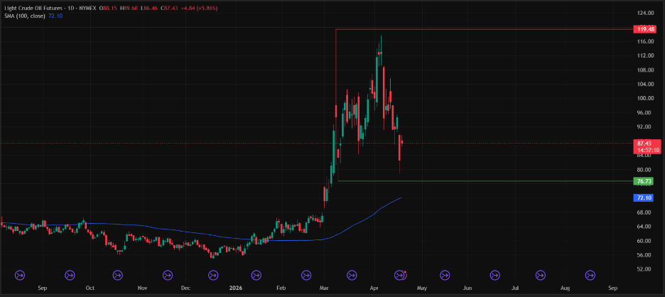 U.S. Oil Futures (WTI) is in a wide, volatile range with a high of $119 and a local low of $76. Trading below this low will signal positive progress with the Iran War and will be important for inflation to ease.