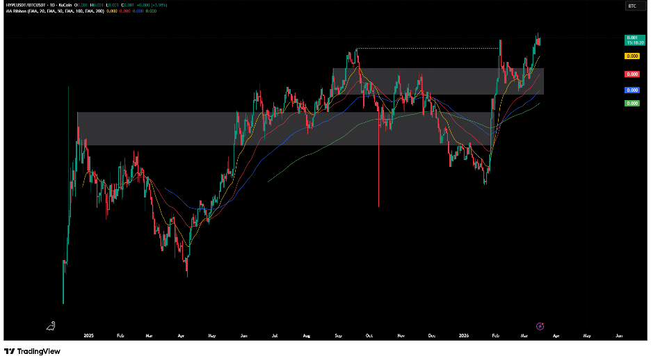 HYPE remains strong versus BTC as it relatively continues to create higher highs after testing the resistance turned support.