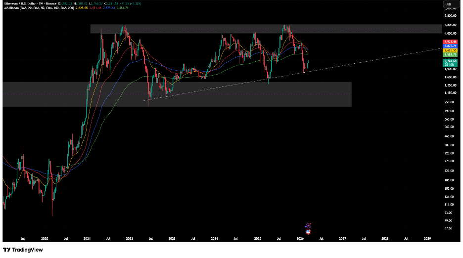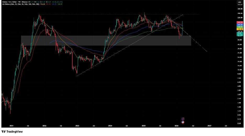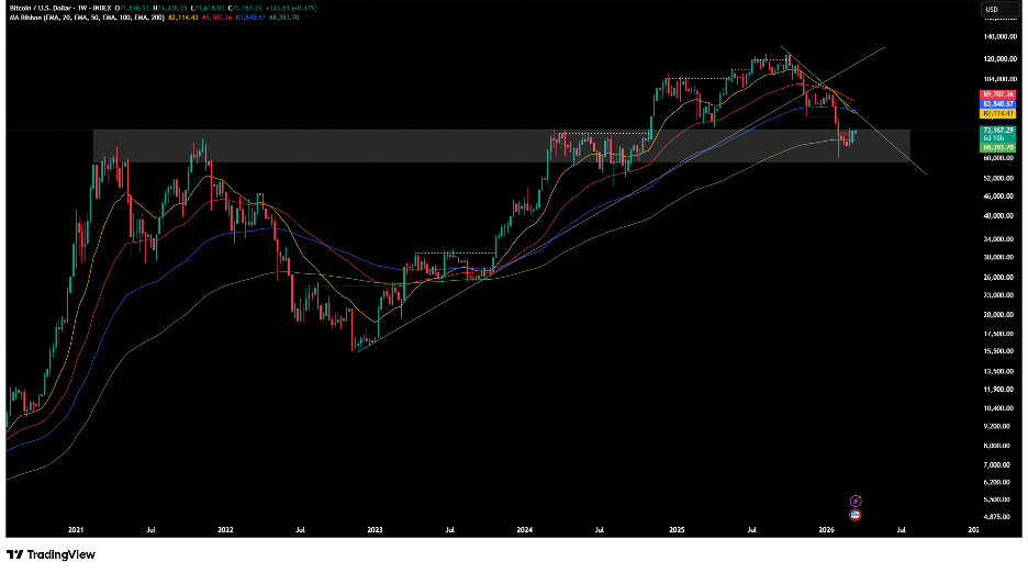 Bitcoin is still at the 200-week moving average and key $65,000–$70,000 psychological support zone. Further decline is expected if this previous resistance turned support zone does not hold. Possible reversal should price decisively break the downward sloping trendline.